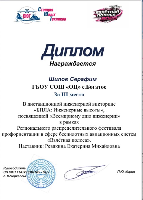 Ученик 10 класса Шилов Серафим занял 3-е место в дистанционной инженерной викторине «БПЛА: Инженерные высоты».